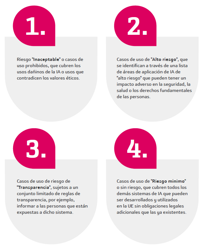 El Acta categoriza las aplicaciones de IA en 4 niveles de riesgo desde el más alto hasta el más bajo, y tiene muchas referencias explícitas e implícitas al procesamiento facial, como el uso de sistemas de identificación biométrica en tiempo real en espacios públicamente accesibles para fines de aplicación de la ley.